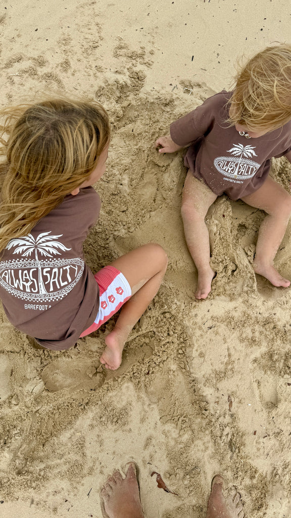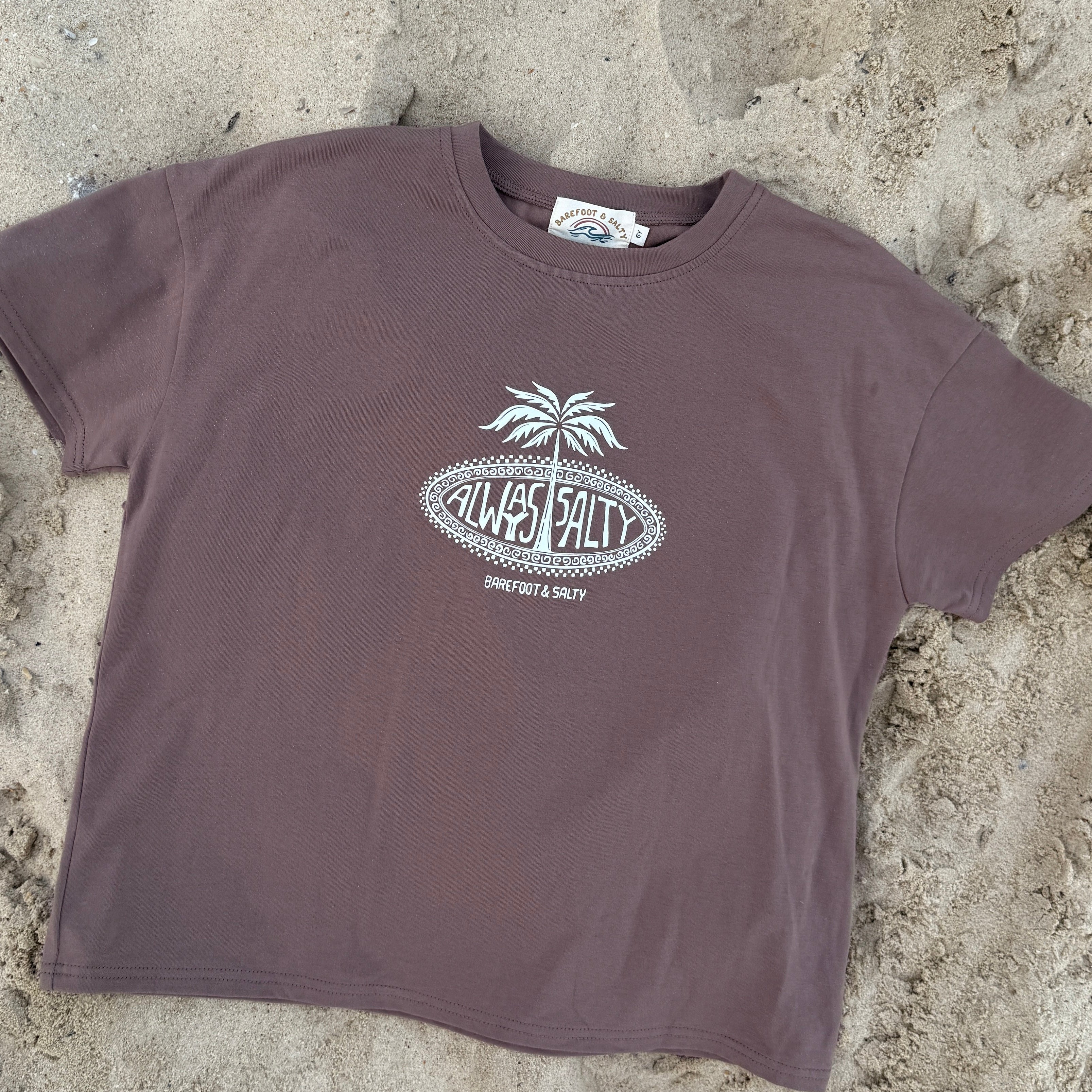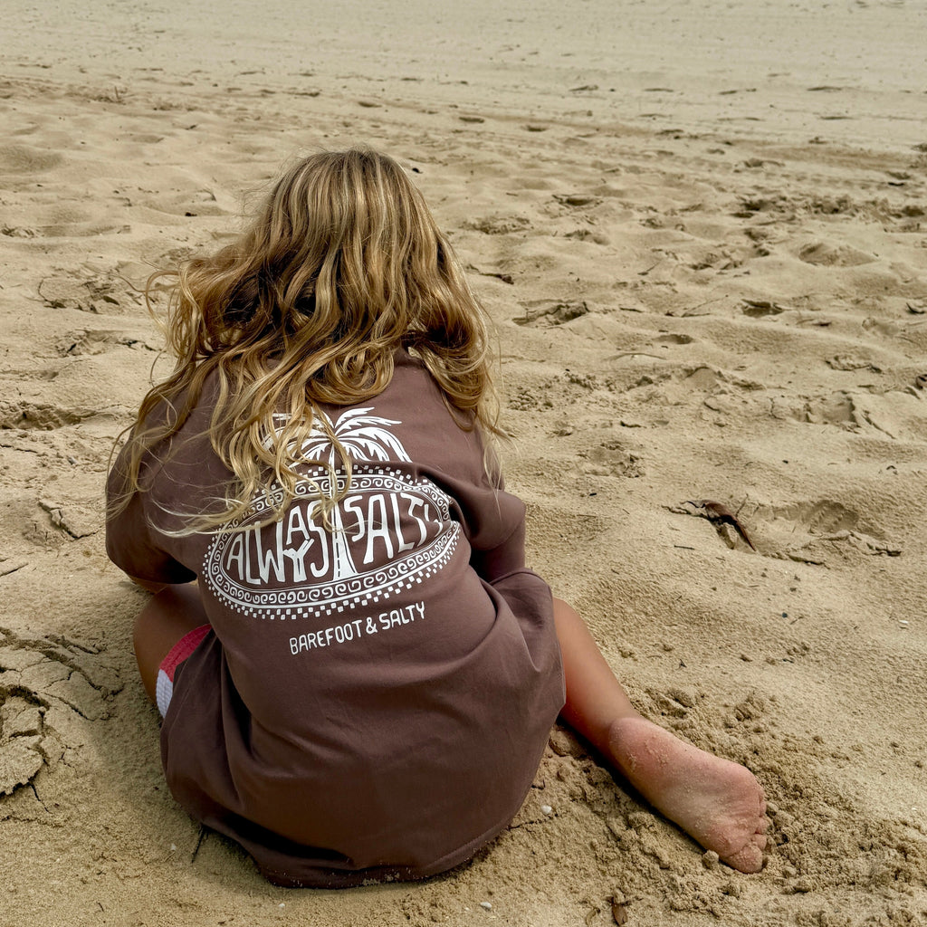 Featuring our Always Salty palm print in a soft chocolate brown tone, this tee is simple, earthy and effortlessly cool. It is the kind of colour that hides the dirt, matches everything and still looks good after a full day of chaos.