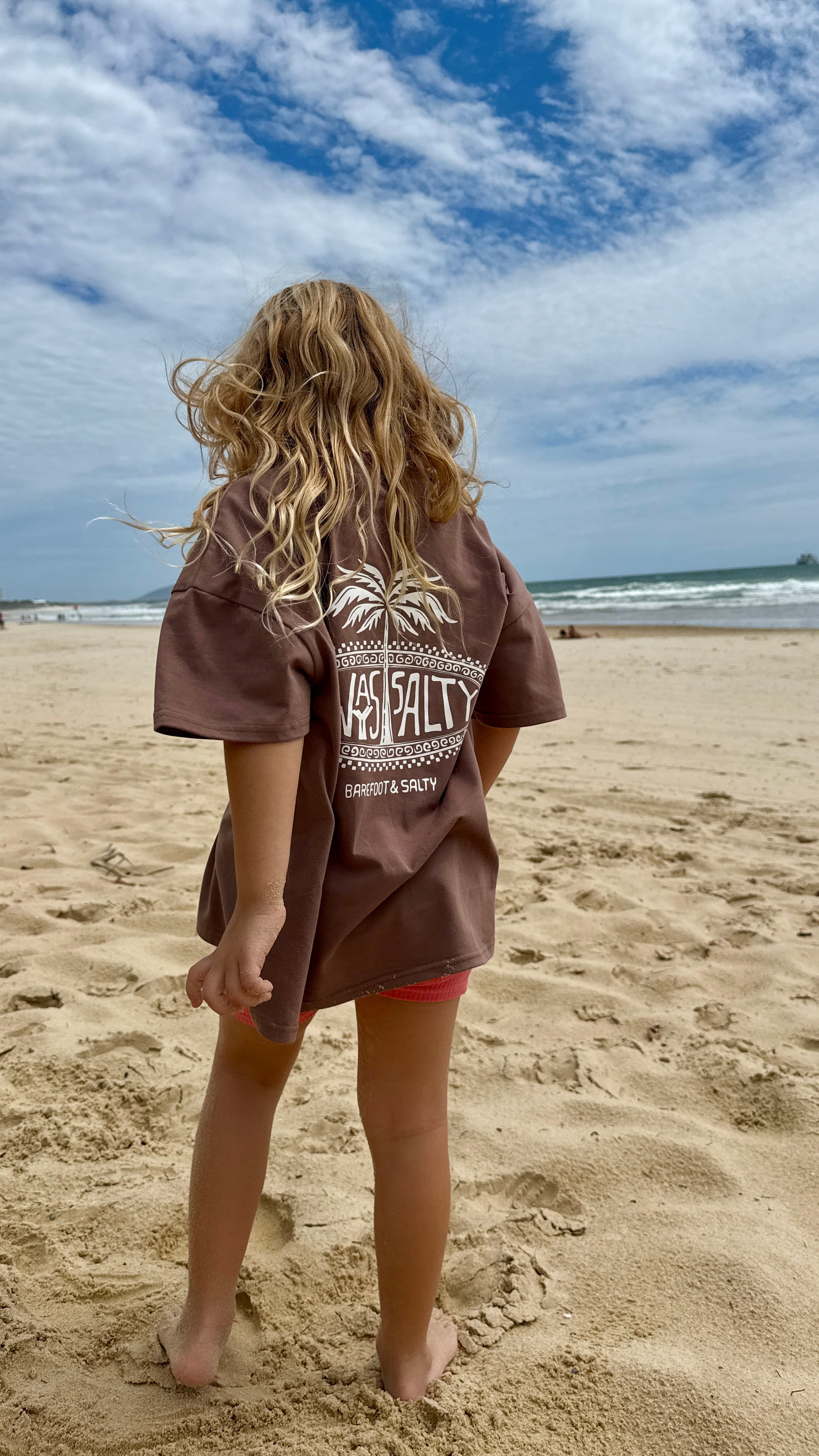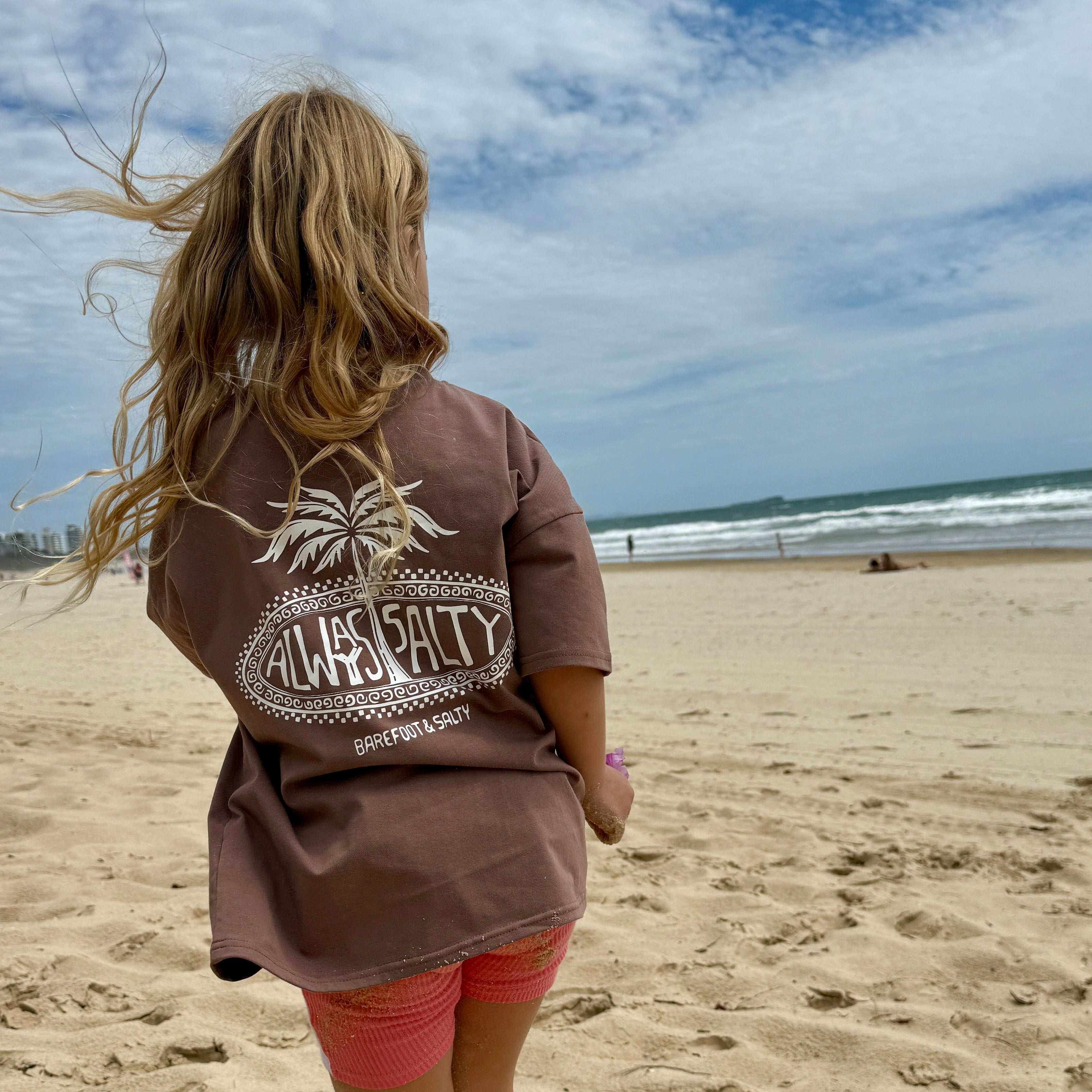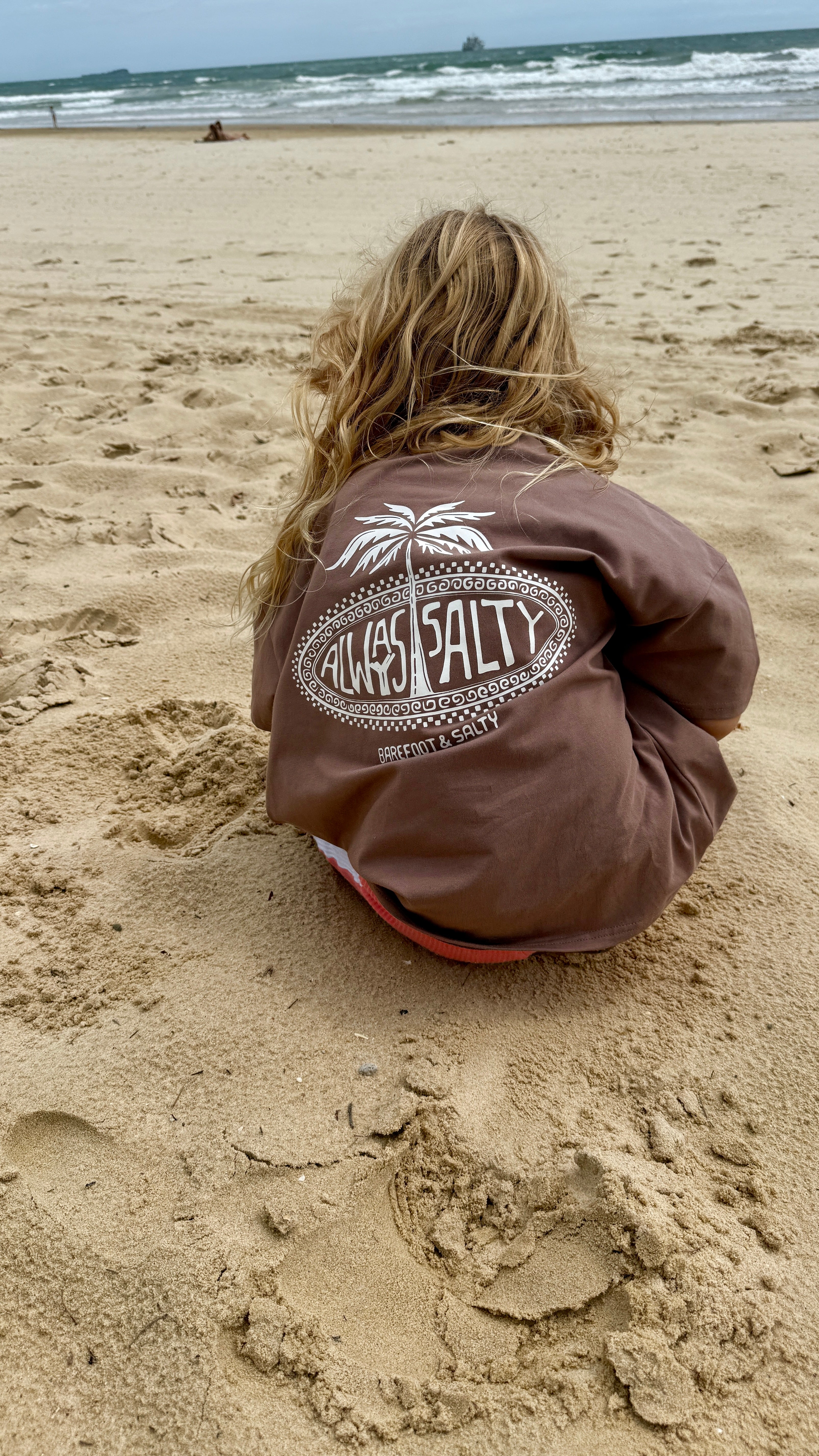 Featuring our Always Salty palm print in a soft chocolate brown tone, this tee is simple, earthy and effortlessly cool. It is the kind of colour that hides the dirt, matches everything and still looks good after a full day of chaos.