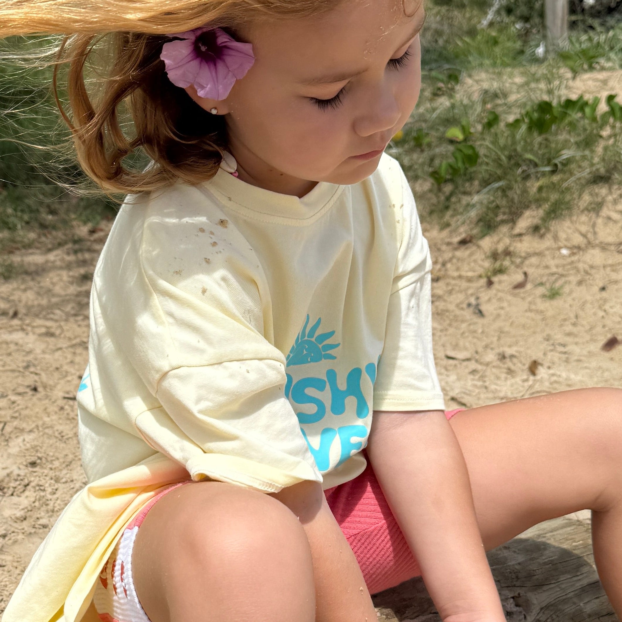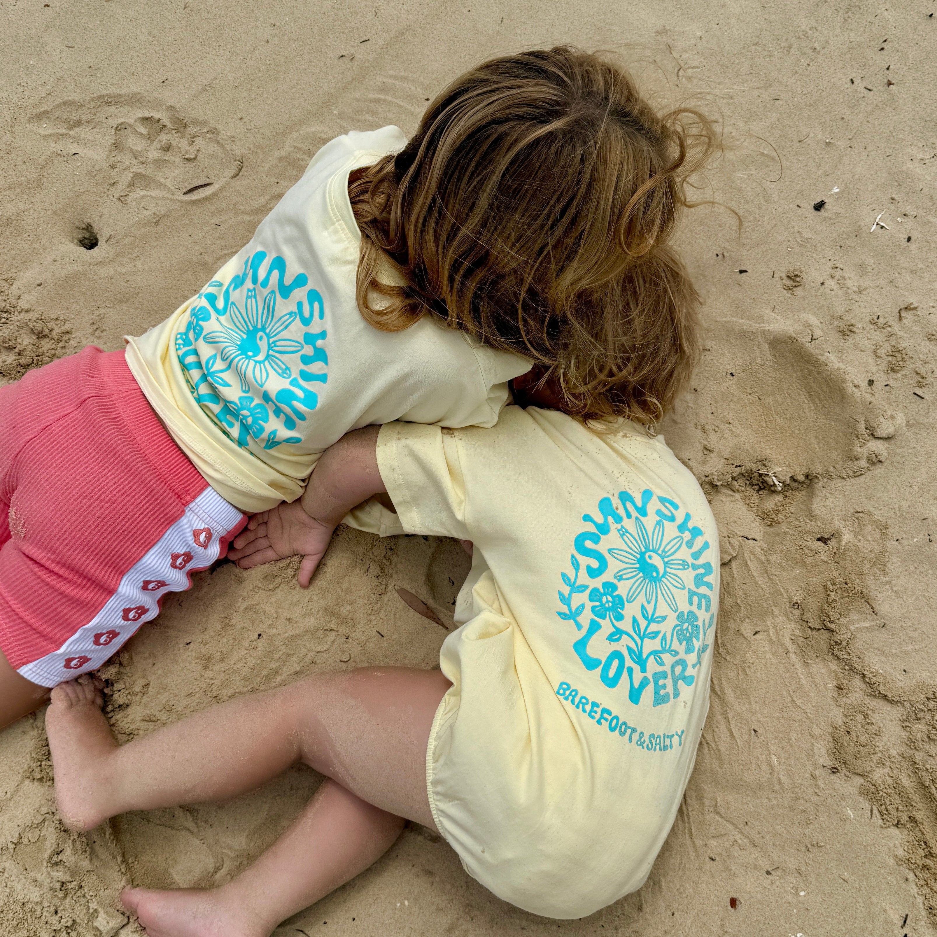 This romper is for the kids who wake up already chasing the sun. Nothing a hit of sunshine cannot sort out and if you could chuck everything a true coastie loves into one piece this would be it. By coastie I obviously mean me because I am the biggest sunshine gremlin to ever walk this earth and I made this for kids just like that.